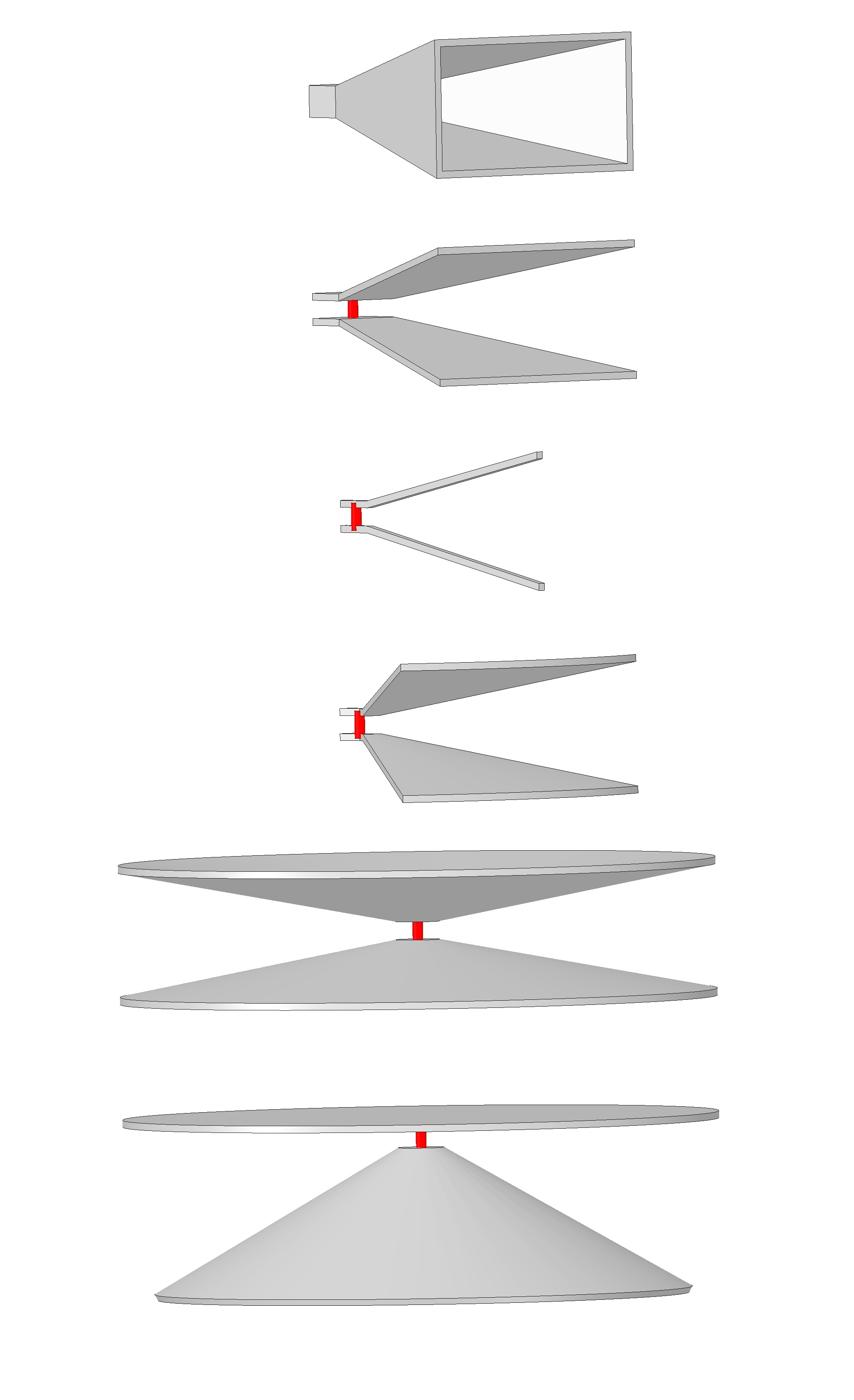 As with most antenna’s there are a number of ways to look at how they work. Personally, I like to imagine how the antenna can be created by gradually adapting the shape of an antenna that I previously understood. At every point in this transformation a new antenna can be created that should in theory work, although may need some tweaks with the feed structure and impedance matching. This is often the way I will explain to people how an antenna works, so here is a quick example.