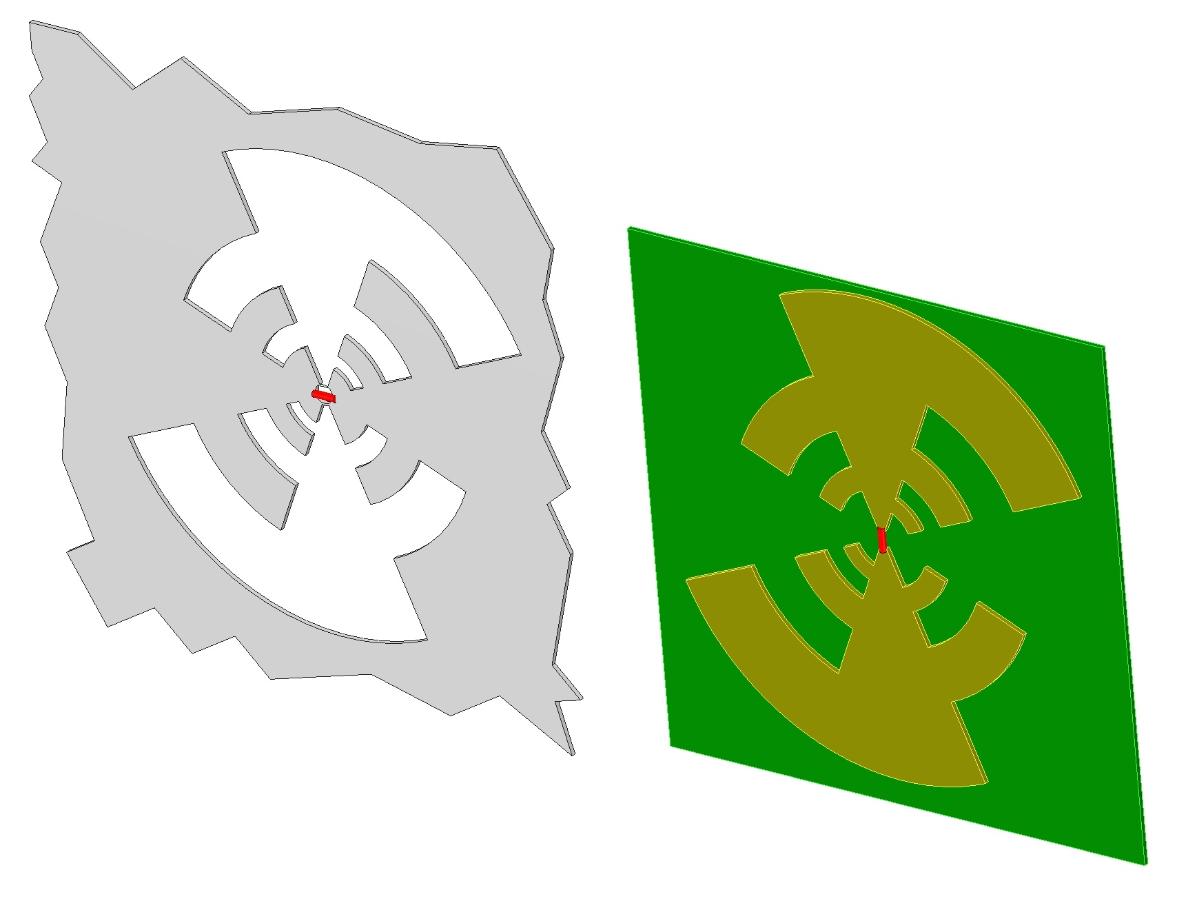 Normally a 2d PCB printed antenna, this normally consists of a circlular (or semi-circular) antenna element above a ground plane(or above another circular element for a dipole style). Sometimes these antenna use elliptical or exponential curves instead of pure circles. In 3D implementations they use 3D spheres orhemi-spheres.
